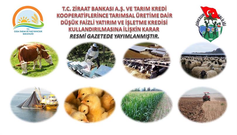T.C. Ziraat Bankası A.Ş. ve Tarım Kredi Kooperatifleri tarafından tarımsal üretimin deteklenmesine dair düşük faizli yatırım ve işletme kredisi kullandırılmasına ilişkin karar resmi gazetede yayımlanmıştır.